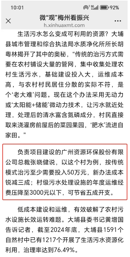 负责项目建设的广州资源环保股份有限公司总裁张晓健说,以这个村为例,按传统模式治污至少需要投入50万元,新办法成本锐减三成;村级污水处理设施的年度运维经费压降至3000元以下,可节省五成开支。