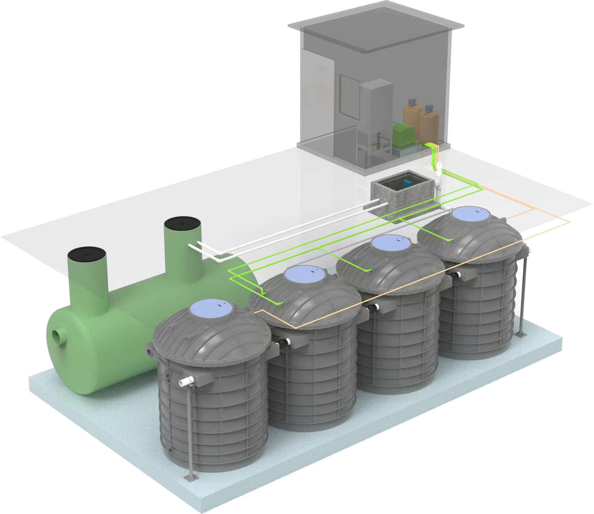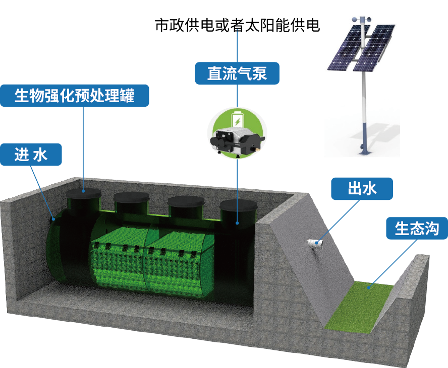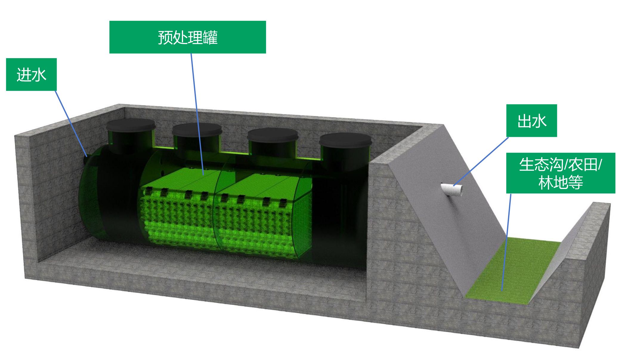 包含隔渣与沉淀区、生化区、清水区三级池体,污水经预处理罐处理后进入清水区,通过提升泵将清水提升输送至资源化利用受纳体。