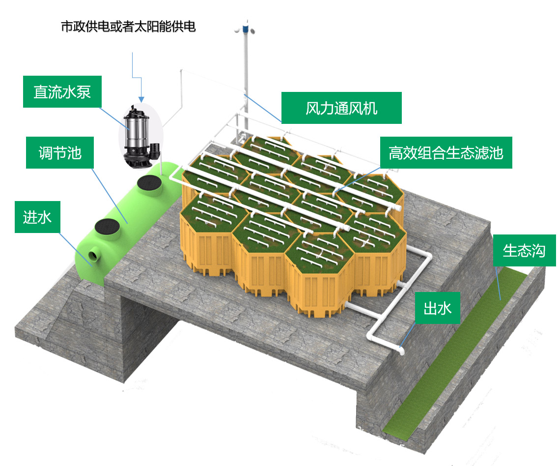 标准化装配式处理单元组合而成,配套布水系统、生物滤料系统,结合植物供氧和强化自然复氧双重作用,实现有机物的高效去除,保留植物所需的氮磷营养元素。